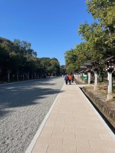 ○橿原神宮に到着後、奈良芸術短期大学の職員の方にご引率いただき、静かなたたずまいの境内を見学しました。